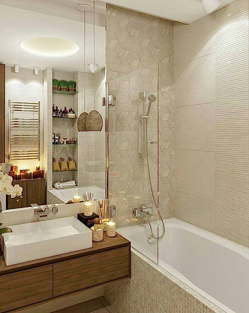 подходом. Если она достаточно маленькая, то в качестве декора лучше использовать светлые тона. Они Pin Up увеличивают пространство. Дополнительно подойдут глянцевые материалы. Например, глянцевые натяжные потолки. Отличное решение для визуального увеличения пространства и для безопасности от затопления. К тому же плитки не должны быть большими.