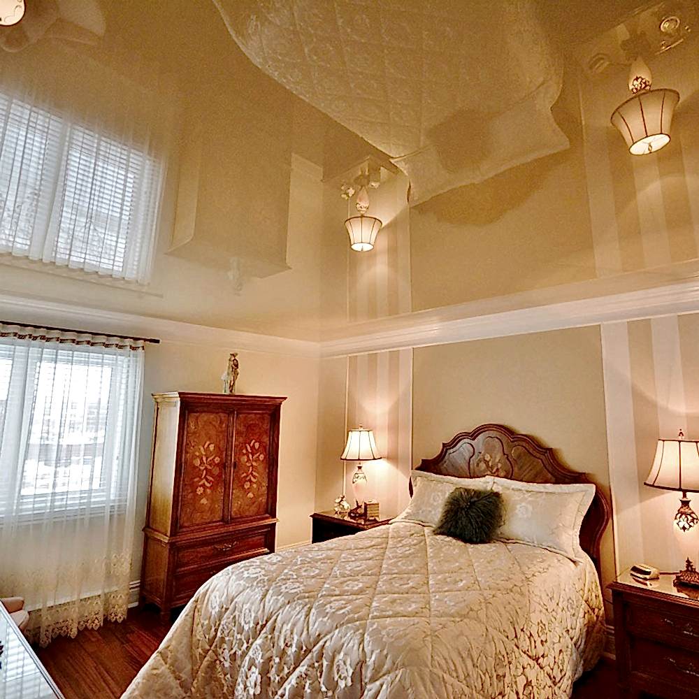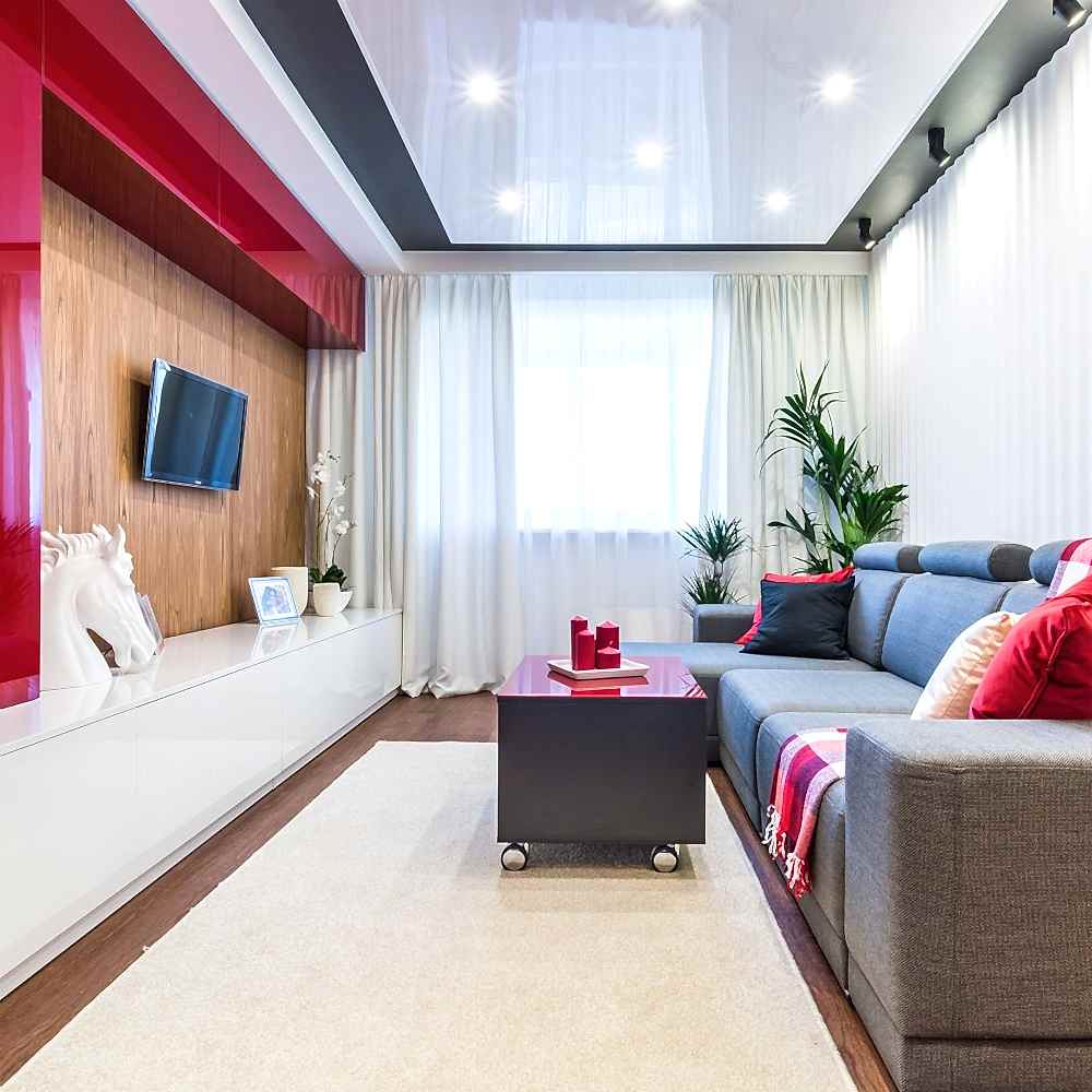 В Pin Up помещении лучше делать глянцевые натяжные потолки. Использование этого полотна помогает достичь визуального расширения пространства комнаты при правильно подобранном освещении.