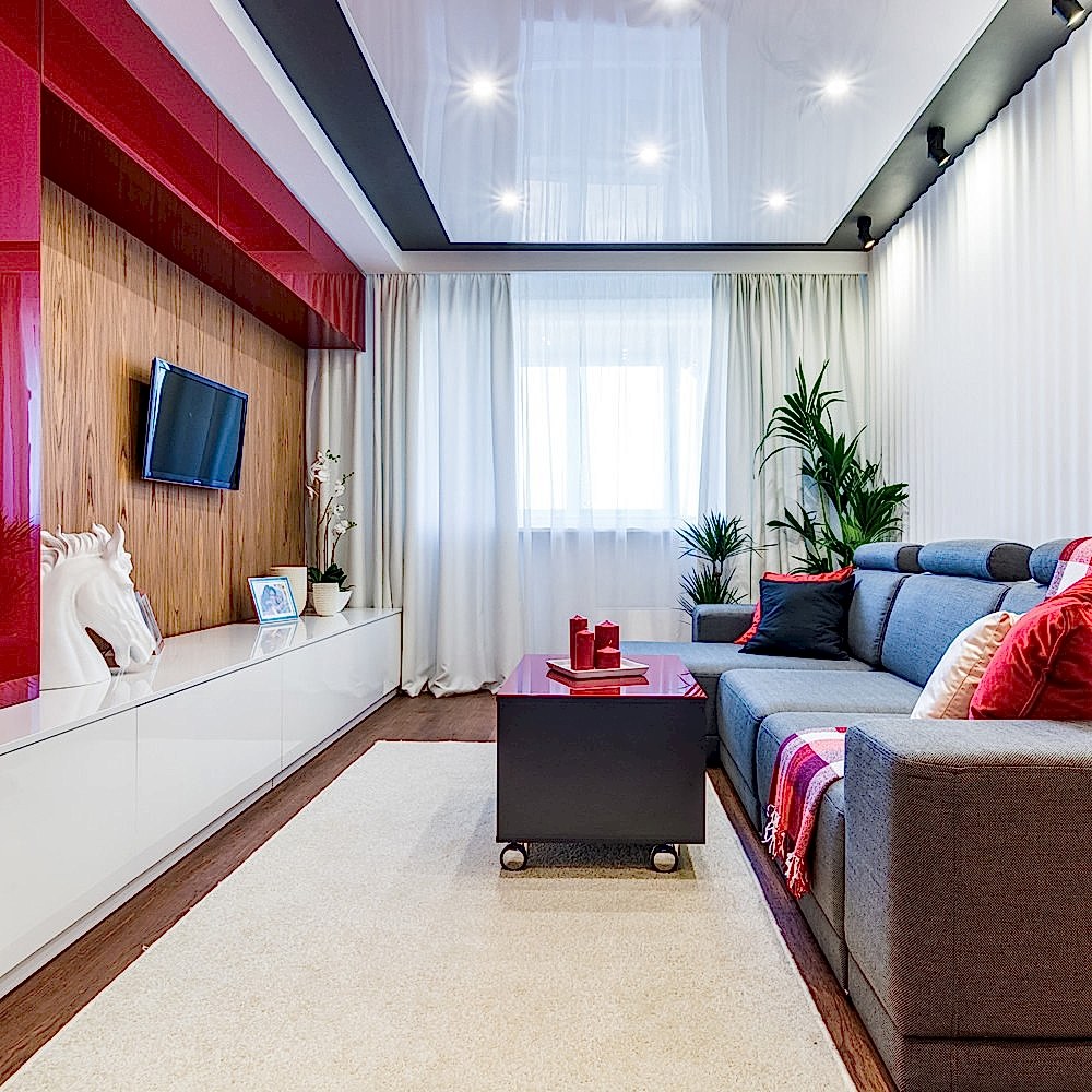 В маленьком помещении лучше делать глянцевые натяжные потолки. Использование этого Pin Up помогает достичь визуального расширения пространства комнаты при правильно подобранном освещении.