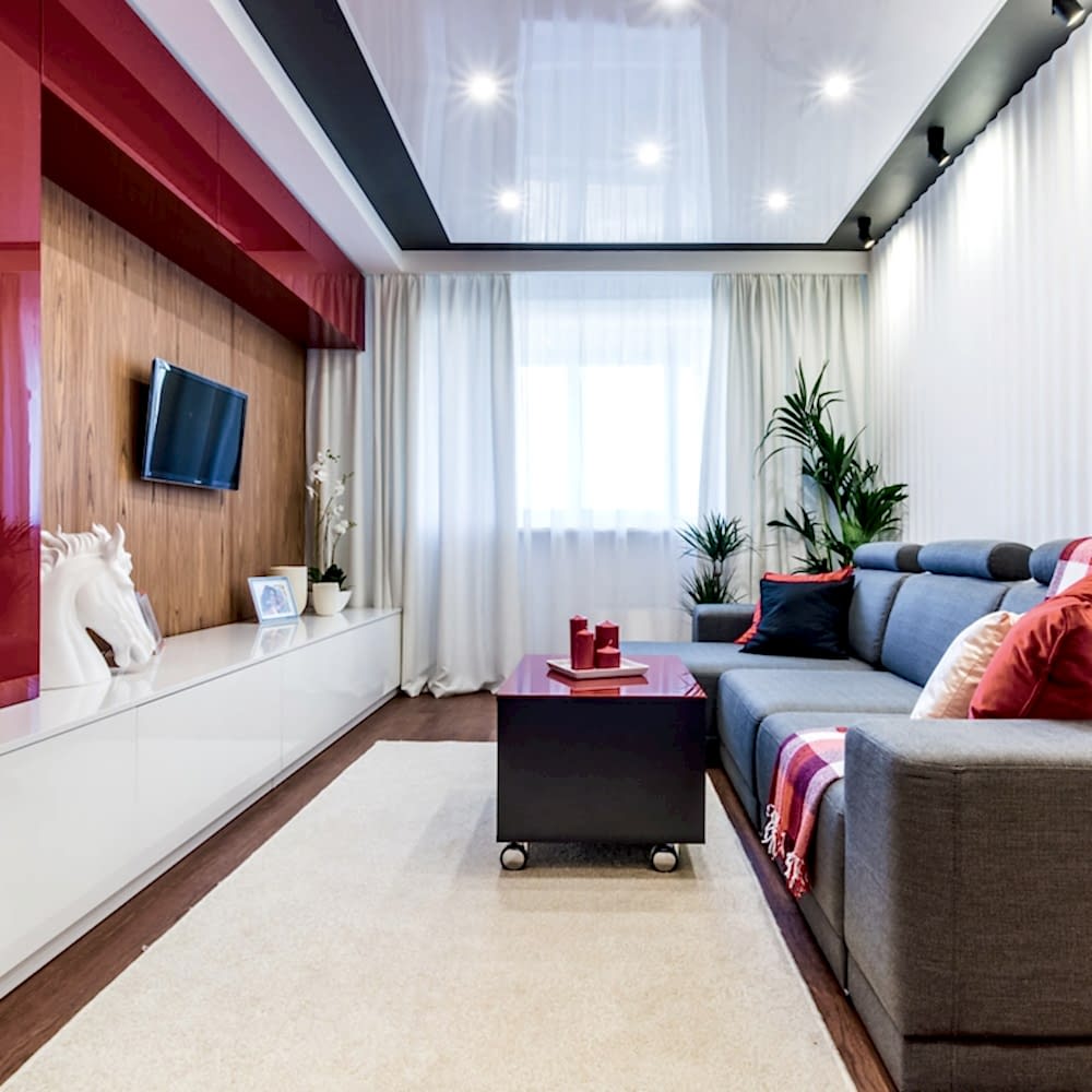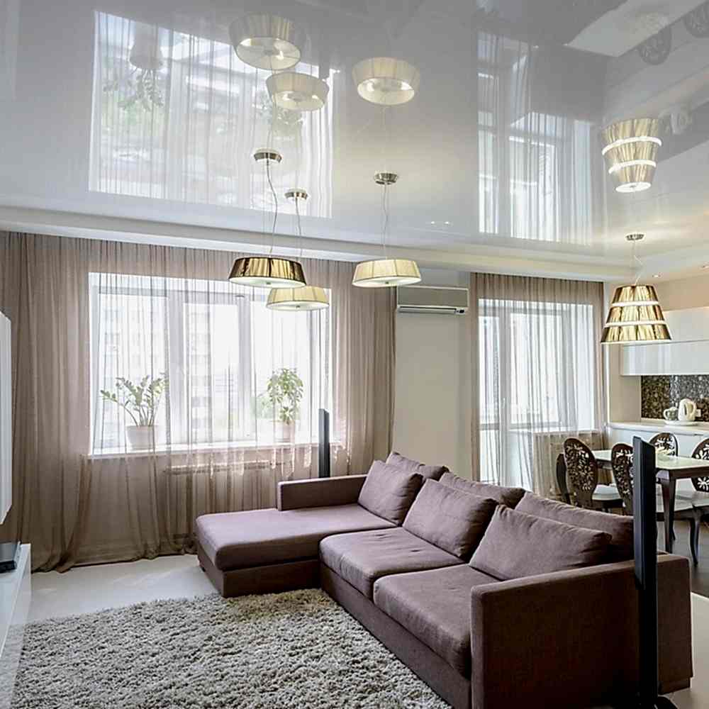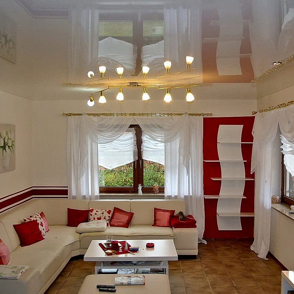 В маленьком помещении лучше делать глянцевые натяжные потолки. Использование этого полотна помогает достичь Pin Up расширения пространства комнаты при правильно подобранном освещении.